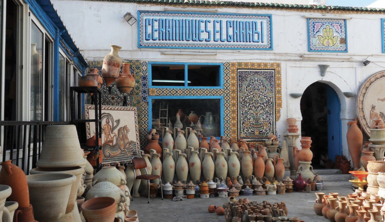 Les étals devant les échoppes de produits artisanaux débordent de couleurs, et les artisans façonnent encore leurs objets devant les passants. La poterie est ici une véritable signature. Assiettes peintes, jarres décorées, carreaux multicolores racontent une tradition transmise de génération en génération. Chaque boutique semble être un atelier, et chaque objet porte la trace d’un geste appris dans l’enfance. Le souk n’est pas seulement un lieu de commerce. Il est un théâtre quotidien où se croisent habitants, visiteurs, marchands et familles venues faire leurs achats. On y parle, on négocie, on rit. Le temps semble s’y ralentir, comme si la modernité restait à la porte pour laisser place à une sociabilité ancienne. C’est souvent ici que le voyageur ressent le mieux l’âme de Nabeul, dans ce mélange de simplicité et de chaleur humaine.